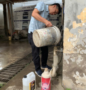 3️⃣ Đổ đầy dung dịch vệ sinh Off-Car DPF Cleaner, đảm bảo dung dịch tiếp xúc hoàn toàn với bề mặt lọc. (2L dung dịch+2L nước sôi 70-80℃)